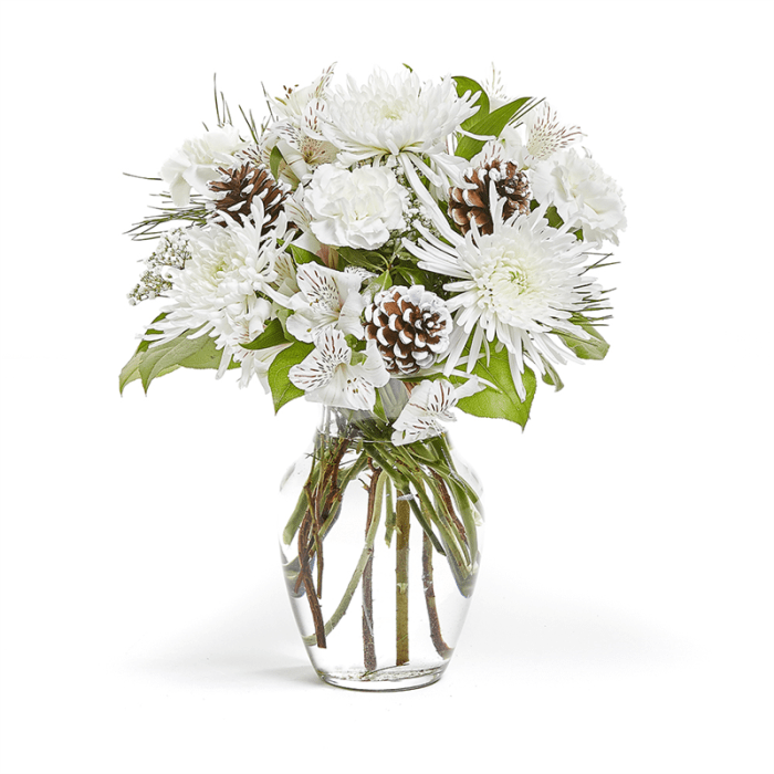 Send seasons greetings with this charming vase in white and green. This arrangement includes white spiders, carnations, babies breath, seasonal greens and more and is just right for a friend, colleague or loved one.