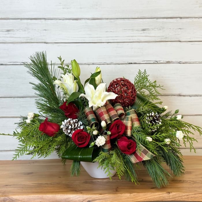 Home for the Holidays is available as a one sided arrangement perfect for an entry way or as a two sided arrangement for your dining table! This is a fresh spin on Christmas featuring a beautiful Oriental lilies, roses, carnations and all the feels in the classic red/white and green Christmas colour scheme.