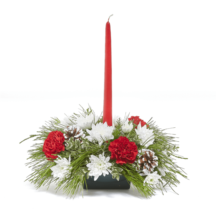 Festive an cheery in red, white and green this is a perfect centrepiece to celebrate Christmas with the ones you love. Red candle is included in this adorable floral arrangement.