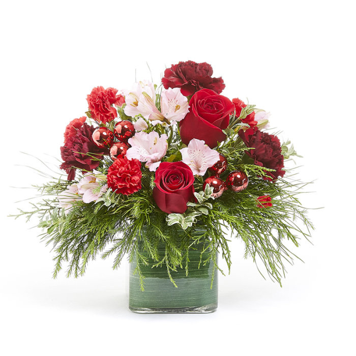 Red roses, burgundy carnations and pink alstroemeria combine to create a rich and luxurious Christmas display. Designed in a glass cube this beautiful compact arrangement is suitable for any recipient or setting.