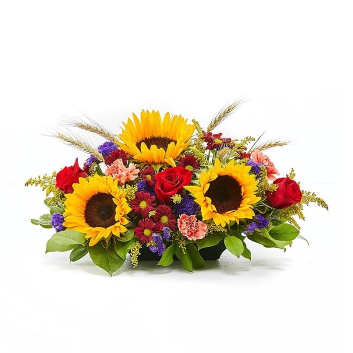 Enjoy long lasting traditions or celebrate new ones with this lovely center piece designed with the best flowers of the season. Sunflowers, red roses and daisies set the stage for your gathering or just to lend the warmth of the season to your home.