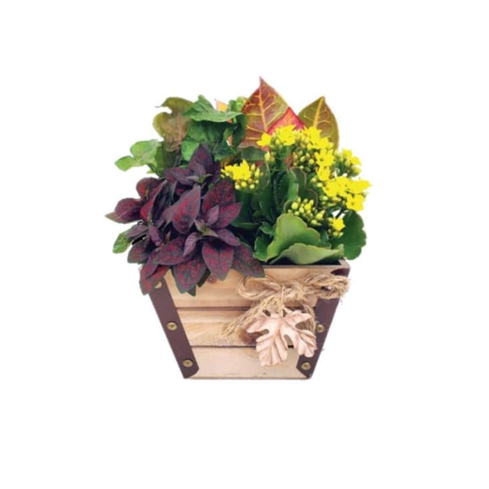 Tropical and flowering plants combine in this 7" square wood/metal container perfectly suited for the fall season.