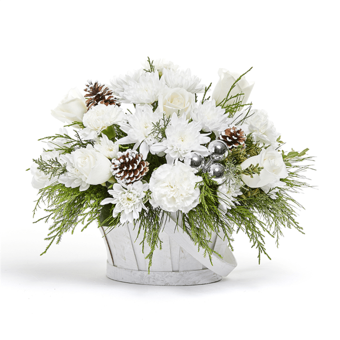 It's beginning to look a lot like Christmas! This basket is a stunning display in white and green. It includes roses, carnations, mums an more and will fit in with any decor.