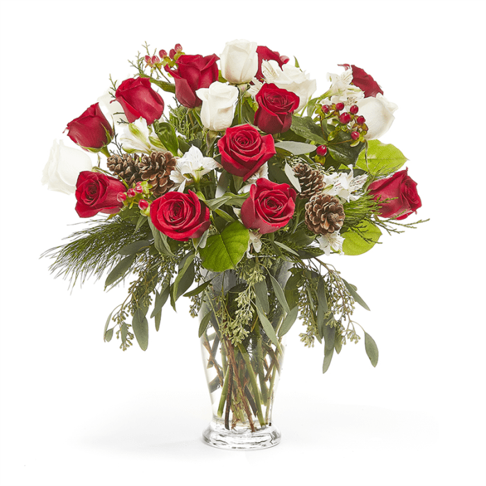 Beautiful and elegant, this vase arrangement features red and white roses along with accent flowers and Christmas greens. It is a stunning display and is perfect to deck your halls or send cheer to those with whom you can't be near.
