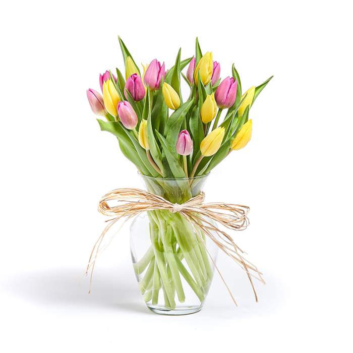 Need we say more? 20 tulips are nestled together to create a fresh splash, perfect for any occasion. Colours of tulips will vary.Tulips may arrive in bud form and will open over several days.Approximately: 10" x 12"