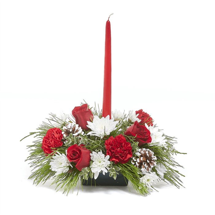 Festive an cheery in red, white and green this is a perfect centrepiece to celebrate Christmas with the ones you love. Red candle is included in this adorable floral arrangement.