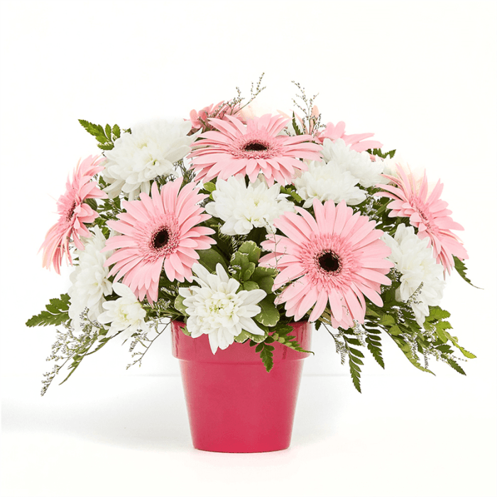 This charming compact arrangement combines vibrant Gerbera Daisies with purple accent flowers to deliver the perfect note of cheer! Nestled in a cute pink ceramic pot, it’s simply delightful and sure to brighten anyone’s day.