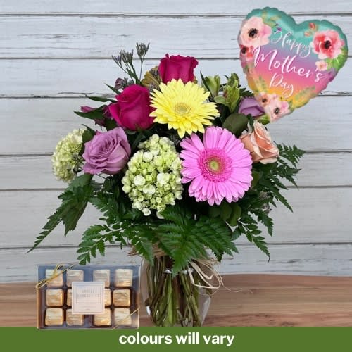Combo includes a box of Annie's Milk Chocolates and a large Mother's Day balloon (designs will vary)
