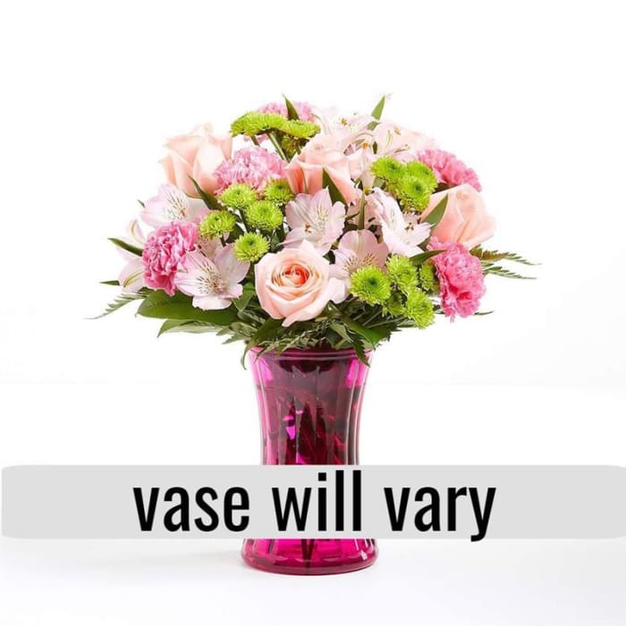 There’s nothing bashful about this purely tantalizing arrangement in pink. Featuring roses, carnations, green kermit chrysanthemums and lilies in the Deluxe and Premium version, this collection of pretty pink florals is sure to provide inspiration and joy.