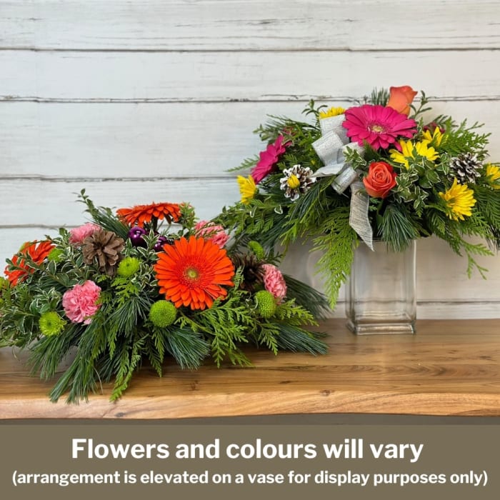 It's Christmas and anything goes! Choose this gorgeous Florist's Choice Christmas centerpiece to make a splash. This will be designed with a variety of available blooms in various colour palettes and will be accented with Christmas greens and festive baubles.