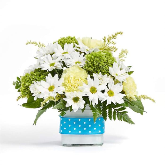 Charming and adorable, this bouquet is the perfect mix of cute to celebrate a new bundle of joy! Yellow carnations, green hydrangeas and white daisies are beautifully arranged in a compact cube, tied with a cheerful blue ribbon. It’s a warm and wonderful way to welcome baby boy into the world!