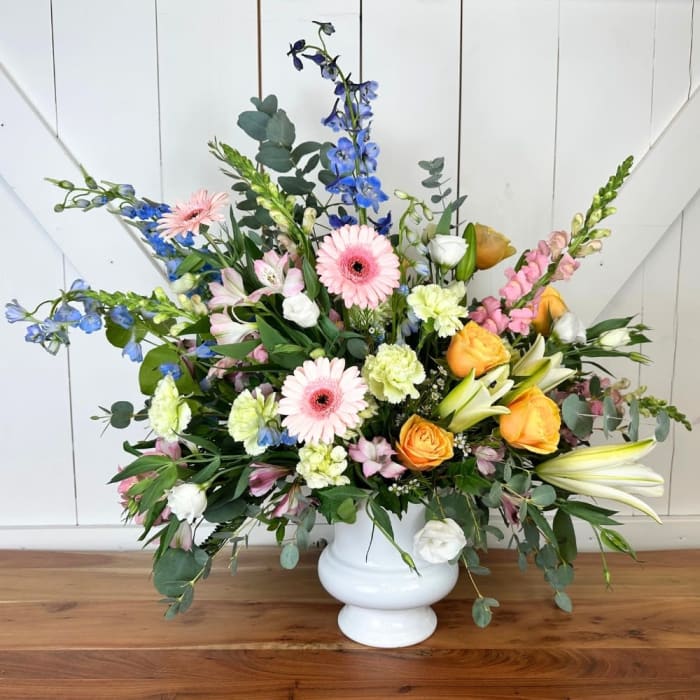 Whispering Garden is a tender and graceful tribute designed to bring comfort through soft, soothing colors and blooms. This feminine arrangement features a delicate palette of pale pinks, light blues, gentle yellows, fresh greens, and pure whites. Thoughtfully arranged with lilies, gerberas, hydrangea, and snapdragons, each stem creates a sense of whimsy and lightness, while maintaining an elegant garden style.